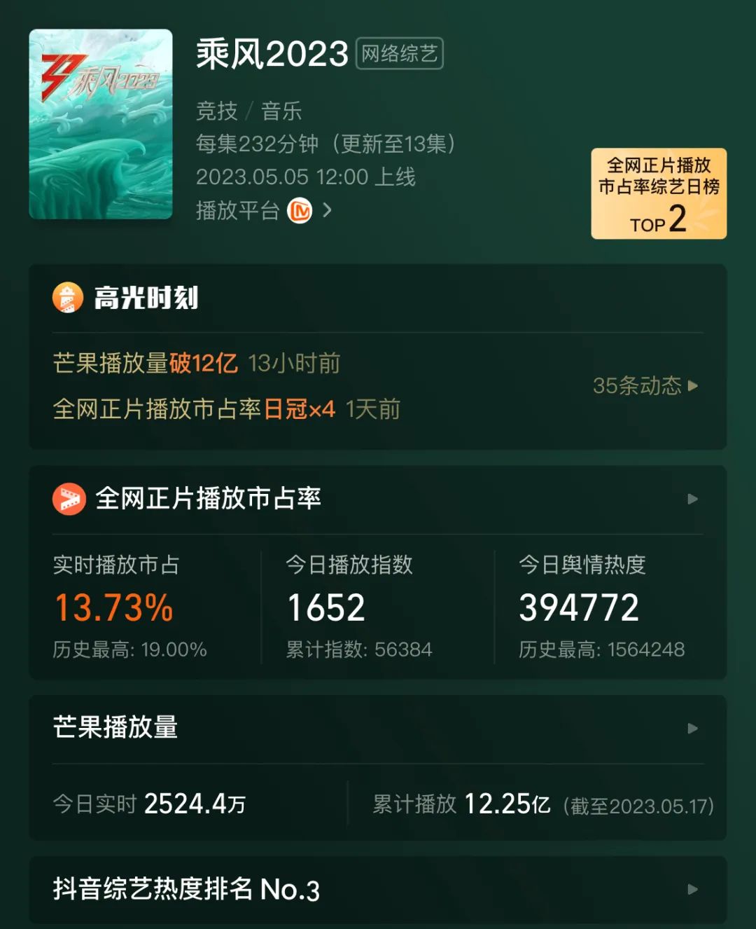 根据灯塔数据,上线12天的《乘风2023》今日全网正片播放市占率13.77%,综艺日榜第二,历史最高是首播当日的19%,目前累计播放12.25亿,首播当日播放量即突破1亿,上线第二天登顶灯塔舆情热度日冠军之席位,并稳稳霸占,目前抖音综艺热度排名第三。