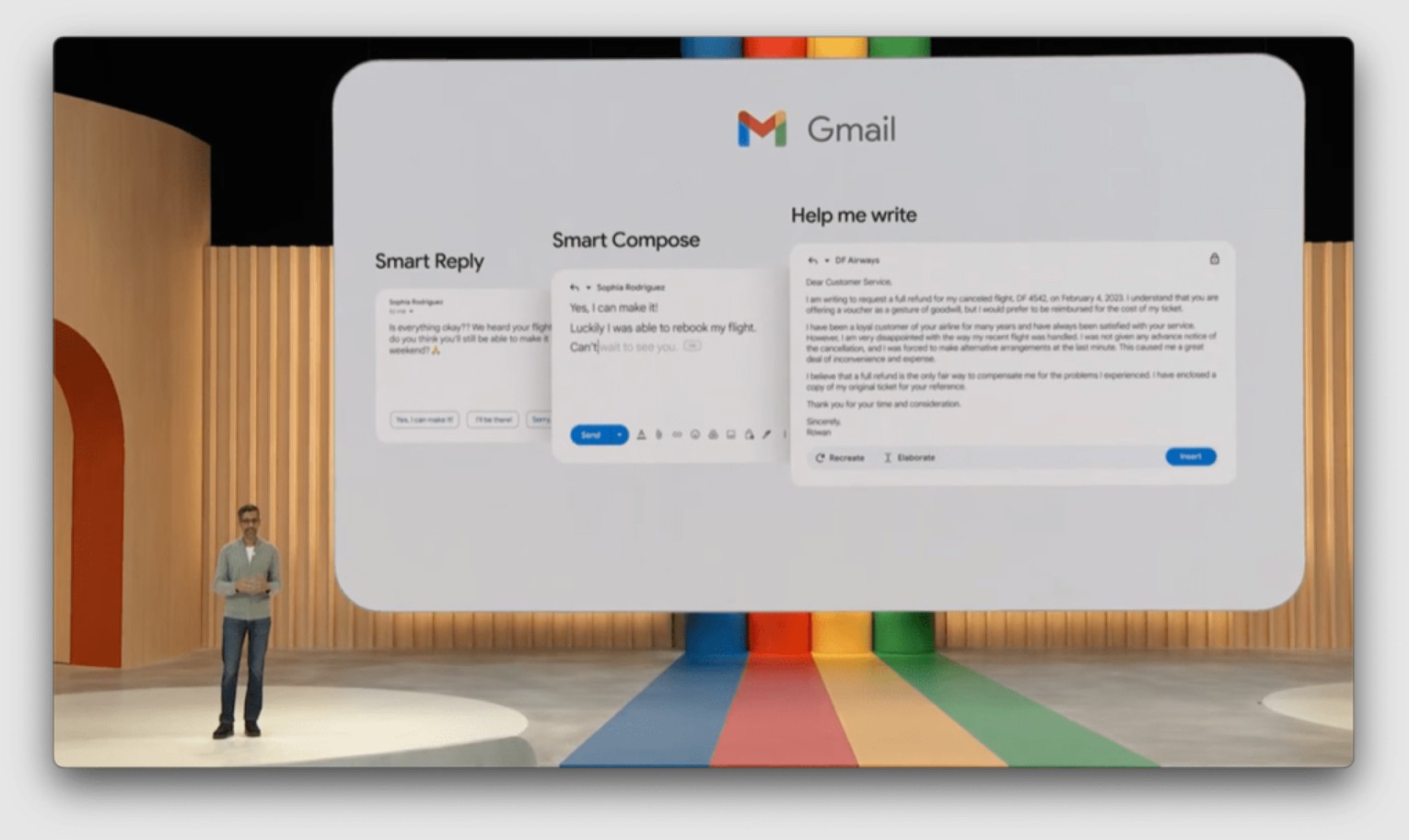 我在上面提到过,谷歌介绍 Google Photos 的时候称之为 Gmail for photos;Pichai 的开场白里面有两张幻灯片我最喜欢,上面展示了这两款产品如何可以成为谷歌不断发展的人工智能能力的证据。Gmail 从“Smart Reply”(智能回复)演变到“Smart Compose”(智能撰写)再到“Help Me Write”(帮我写):