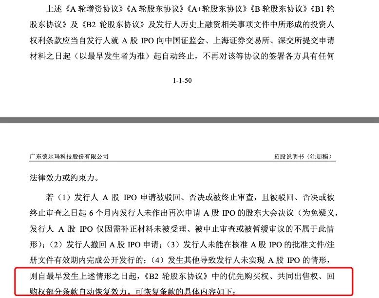 同时,针对《B2轮股东协议》中的优先购买权、共同出售权、回购权部分条款,德尔玛单独给出了“自动恢复效力”的特殊优待。相当于给天津金米和董海峰开了“稳赚不赔”的后门。