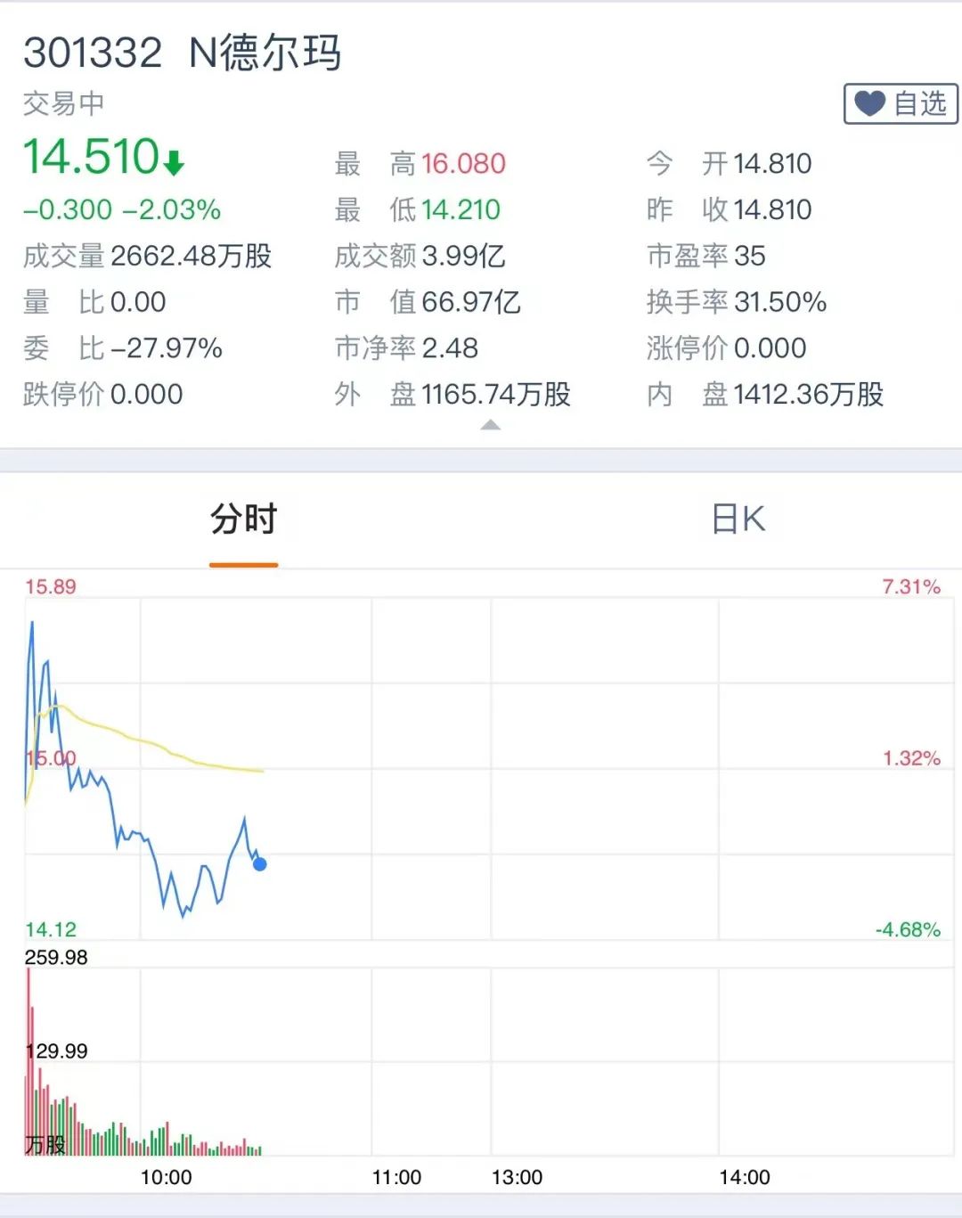 5月18日,广东德尔玛科技股份有限公司(简称“德尔玛”)成功登陆深交所创业板,开盘价为14.81元/股,与发行价持平,开盘后呈现上涨趋势,但随后回落。截至上午10:30分,德尔玛股价为14.51元/股,较开盘价下跌2.03%,市值为66.97亿元。