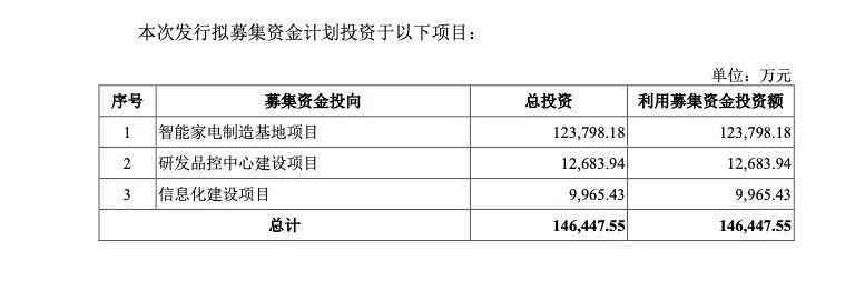 招股书显示,此次募集资金将全部用于公司主营业务相关的项目建设,以提高公司智能家电制造能力、研发品控能力和信息化能力,不断增强公司的核心竞争力。