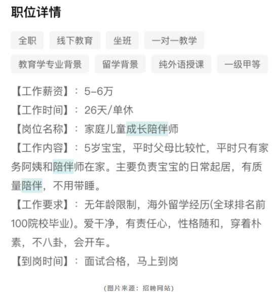 从岗位描述中可以看出,儿童成长陪伴师的工作内容主要是负责儿童的日常起居和陪伴,诸如早教、习惯培养等,薪资高、含假期、晚上不用带睡、不用做家务,实在令人羡慕。但客观来讲,除对外语和学历要求较高之外,儿童成长陪伴师的工作就是全职妈妈工作内容的一部分,此外,全职妈妈还承担着家务阿姨和育儿嫂的职责,且全年无休。