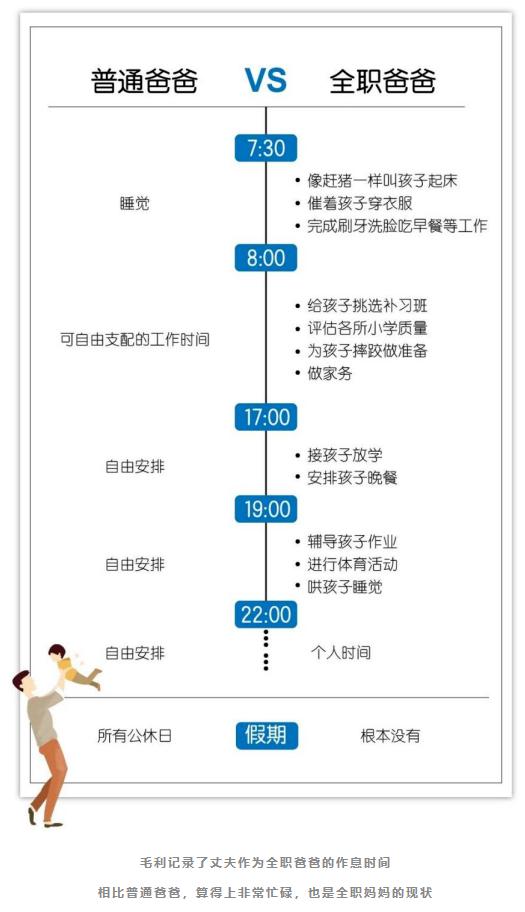 与全职妈妈的普遍相比,“全职爸爸”算是珍稀动物,作家毛利的丈夫小陈就是一名稀有的全职爸爸。在毛利和小陈都还是新手爸妈的时候,他俩约定“将来谁成功了就回来带孩子”。几年后,毛利的小说卖了版权,入账一百多万,此时小陈33岁,在公司是一个小团队的领导,月薪2万。小陈兑现承诺,回家全职带6岁的儿子,毛利每月按照小陈之前的月薪给他发2万元工资。毛利坦言,给小陈发工资的初衷是为了自己“可以更加居高临下、理直气壮”:“如果不发钱,在小陈忙着做饭带孩子的时候,难免会对我气不打一处来:你就不能帮忙干点什么吗?”