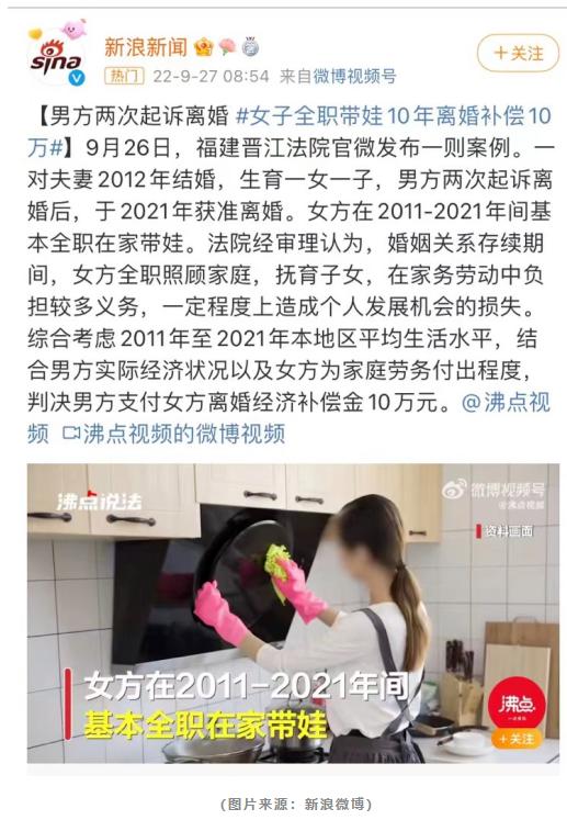 22年9月,一个“女子全职带娃离婚补偿10万”的新闻冲上热搜。福建晋江的一对夫妻结婚10年,育有一子一女,丈夫2次起诉要求离婚,法院判决书中提到:“在原、被告婚姻关系存续期间,被告全职照顾家庭,抚育子女,在家务劳动中负担较多义务,一定程度上造成个人发展机会的损失。综合考虑2011至2021年本地区平均生活水平,结合原告的实际经济状况以及被告为家庭劳务付出程度,判决原告支付被告离婚经济补偿金10万元。”热搜词条下的评论几乎一边倒的表示“对女方很不公平”、“请保姆都不止这个数”、“不要结婚、不要生孩子”等。