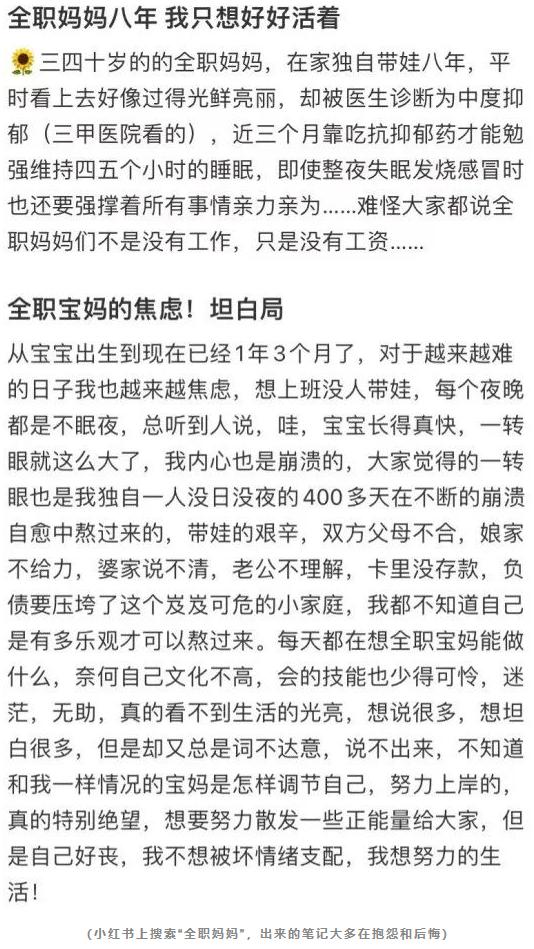 电视剧《三十而已》里,童瑶饰演的女主角顾佳是一个堪称完美的全职妈妈,有学历有能力,生完孩子之后仍保持着完美身材,丈夫的公司遇到难题她也能帮上忙,生活打理得井井有条,上得了厅堂下得了厨房。然而现实中,大多数全职妈妈的生活却是一地鸡毛,小红书上搜索“全职妈妈”,出来的笔记大多都在抱怨和后悔。繁重的家务、没有存款、周围人的不理解、甚至来自于子女的鄙视,使得很多全职妈妈处于崩溃的边缘。