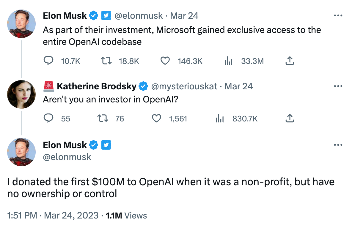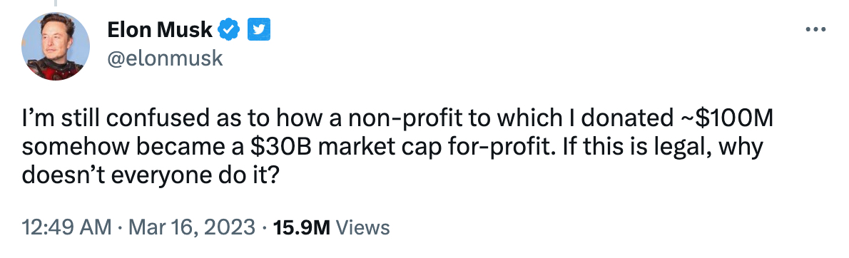 “我仍然感到困惑的是,我捐赠了约 1 亿美元的非营利组织如何以某种方式变成了一个市值 300 亿美元的营利性组织。如果这是合法的,为什么不是每个人都这么做呢?” 他在 3 月中旬发布了一条推文。