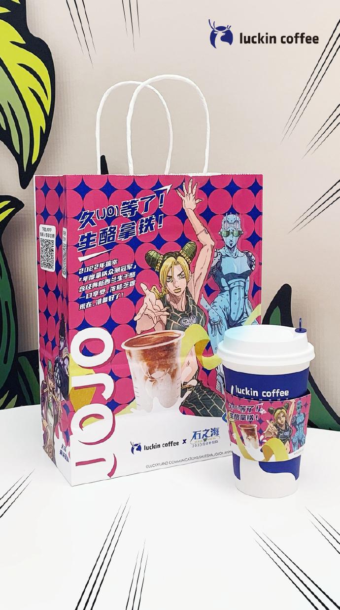 另一种是在已有产品基础上,对其周边礼品、门店等视觉设计进行更新。比如奈雪的茶合作《爱情而已》,主推经典款“霸气青提”系列,提供 Q版毛绒啪嗒圈、钥匙圈等周边;再比如瑞幸咖啡联名《JOJO的奇妙冒险》,主推年度热门单品“生酪拿铁”。