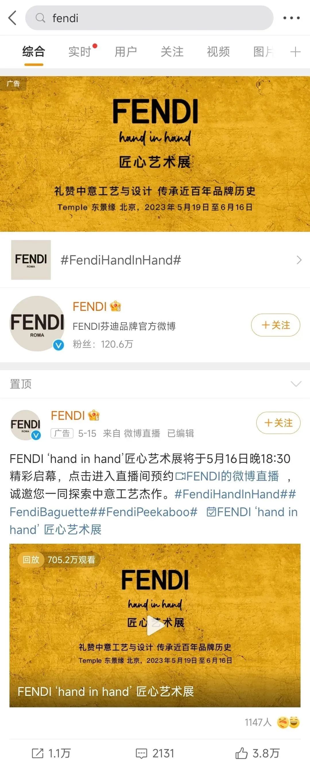 而另一边,FENDI 官方微博等账号则专注宣传“FENDI 'hand in hand' 匠心艺术展”,对联名活动只字未提,保持着奢侈品品牌一贯的“高冷”。