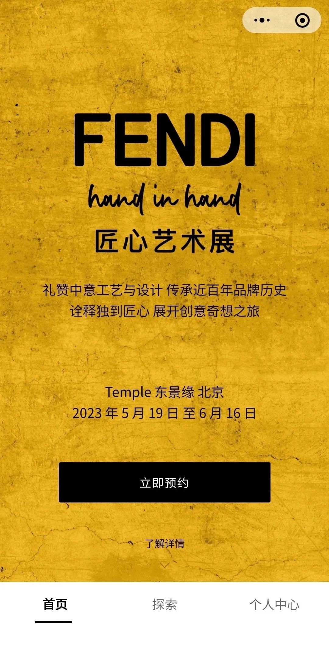 回到本次联名的起点,FENDI 的出发点还是为了宣传自己的艺术展。现在到微博搜索关键词“FENDI”,结果页也显示展览相关内容。FENDI 还专门为了本次艺术展开设了专属活动小程序。刀法通过小程序了解到,截至 5 月 18 日下午,FENDI 本次展览 5 月 19-28 日时间段的名额均已被约满。