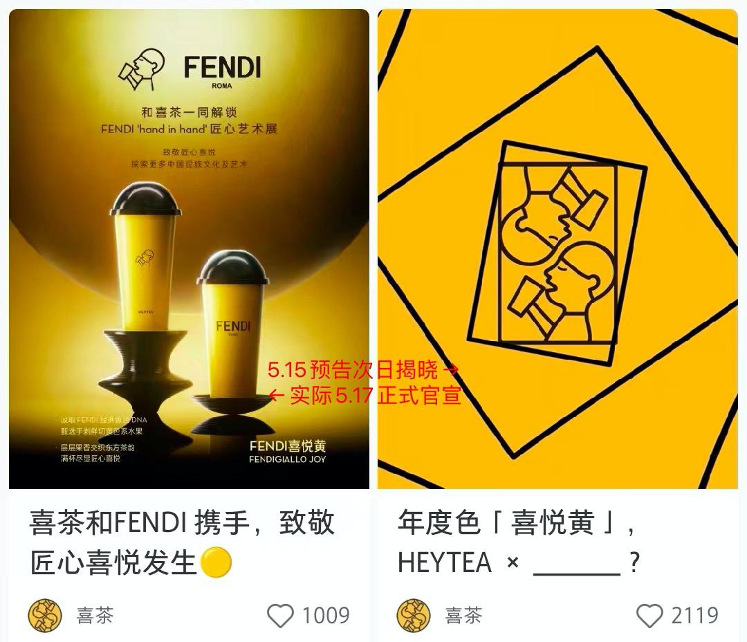 其实早在 5 月 15 日,喜茶就发布了次日将公布全新联名的预告,评论区有人猜测合作方是 FENDI。但到了 5 月 16 日,喜茶并没有如约官宣。
