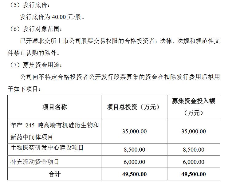 募集资金用途上,公司所募集资金拟用于年产245吨高端有机硅衍生物和新药中间体项目、生物医药研发中心建设项目、补充流动资金项目,募集资金投入额分别为3.5亿元,8500万元、6000万元。