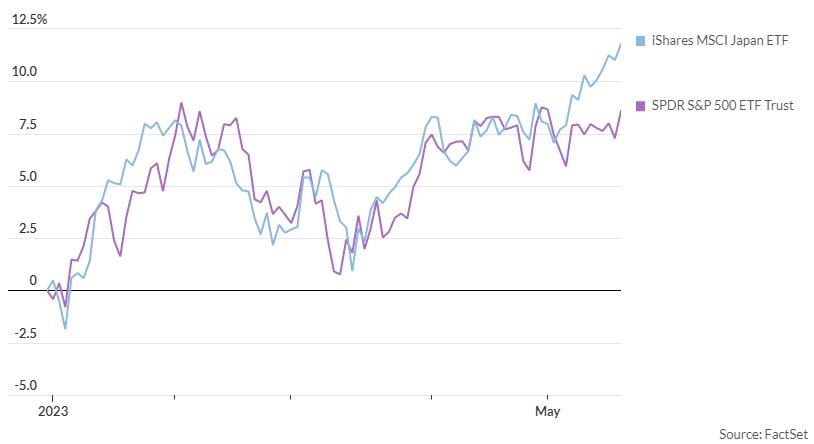跟踪日本股票的最大的ETF——iShares MSCI Japan (WJ)——截至周三上涨了11.8%,相比之下,追踪标普500指数的SPDR S&P 500 Trust (SPY)上涨了8.6%。