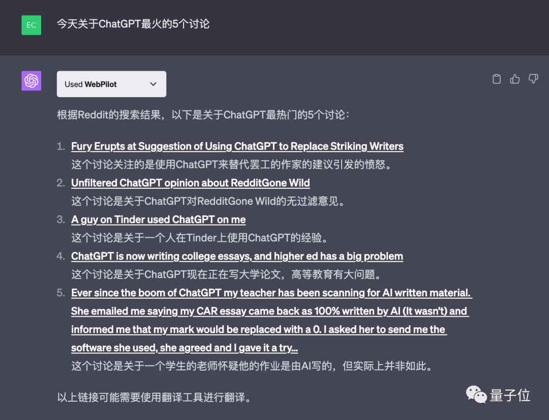 (像我们编辑部,最心水的莫过于用webpilot插件让它去reddit等网站上找出“关于ChatGPT最热门的5个讨论”了。选题从此不慌~)