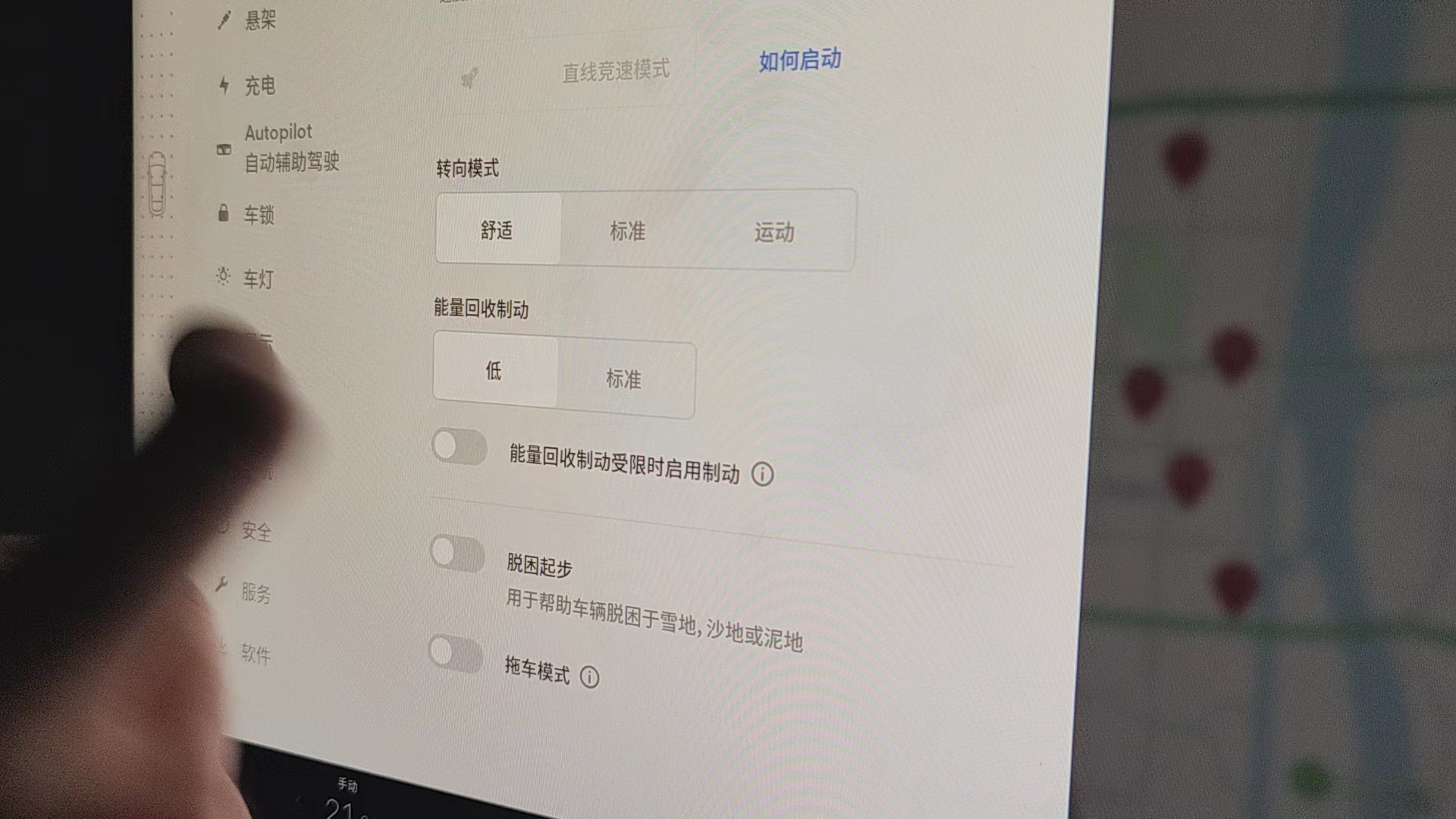 我还特地尝试了一下OTA之后的动能回收策略,系统设置中提供了“低”、“标准”两个档位,下方的“能量回收制动首先时启用制动”。名字实在太绕口,陪驾小哥的意思大概是,当汽车电量充足,动能回收策略松动时,通过刹车来补偿,目的是让汽车在不同的电量阶段下,动能回收的减速力度尽可能保持统一。