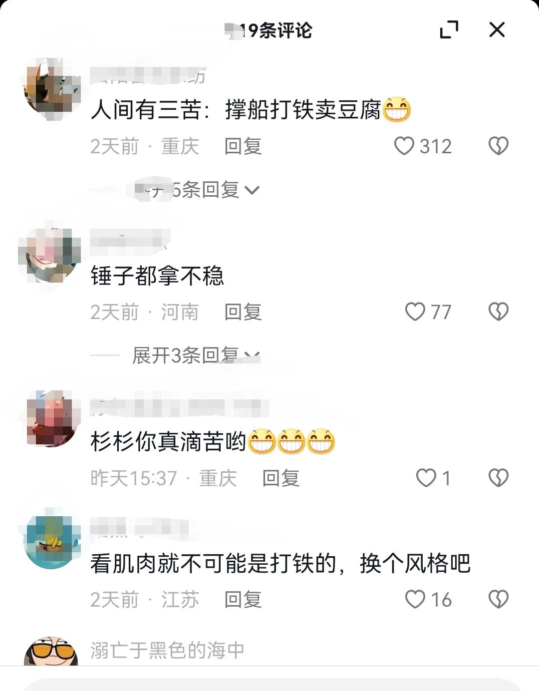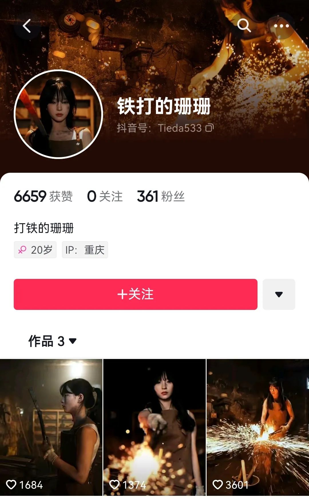 值得注意的是这家公司同时申请的还有一个名为“铁打的珊珊”的商标。在短视频平台搜索的确出现了一个“铁打的珊珊”的账号,这个账号从5月14日开始连续三天发了三条视频,视频中“珊珊”的形象是一位拿着锤头打铁面不改色的姑娘。同样是美女+炫技,但是到目前为止网友似乎并不买“铁打的珊珊”的账。