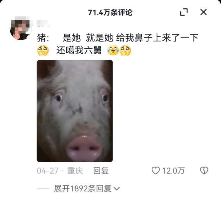 “好端端的猪”虽然短暂,但是在这十几秒的“养猪”叙事中融入了不少设计感的元素,比如捕捉到了从烟雾中猪摇晃着耳朵飞跑起来、小猪斜着眼睛观察周围、人猪对峙等等,这种奇幻式场面,在引发用户的好奇和想象的同时,也吸引了很多受众在评论区互动,纷纷留言从自己的视角和背景出发解读这些名场面的文本,从而“窃取”和重构文本,创造出新的意义和故事。有的在推测猪的心理和动机,给出了很多趣味性十足的回答,比如“猪:有杀气”“猪猪:这该死的压迫感,迟早要栽在你手里”;有的为视频想出脑洞大开的标题。