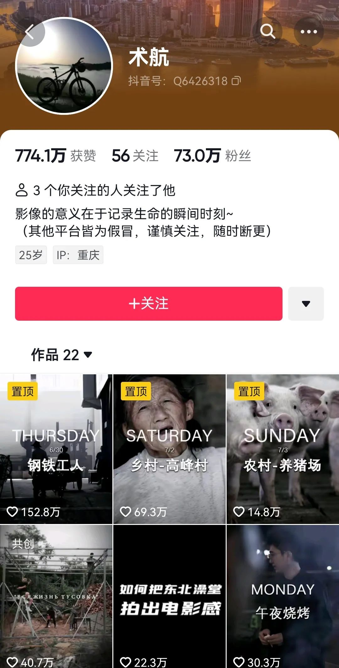 在“配上这则BGM,修猪圈也能拍出高级感”这则视频的评论区“好端端的猪”展示了自己合作的拍摄团队@术航。经过企查查查询,他是一位影视工作室的经营者。顺着“网线”打开这位博主的主页,“将日常生活拍出电影”的中心思想基本贯穿其绝大数的视频,其中“养猪场”的主题也早已被拍摄,一股熟悉感扑面而来,这说明其此类型的创作对于他们来说比较驾轻就熟。