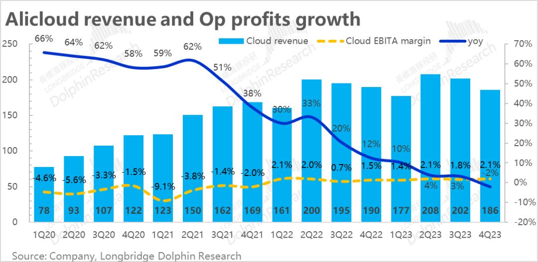 但从利润角度,虽然营收在下降,由于利润率在持续提升,阿里云的EBITA同环比来看,都在增长。