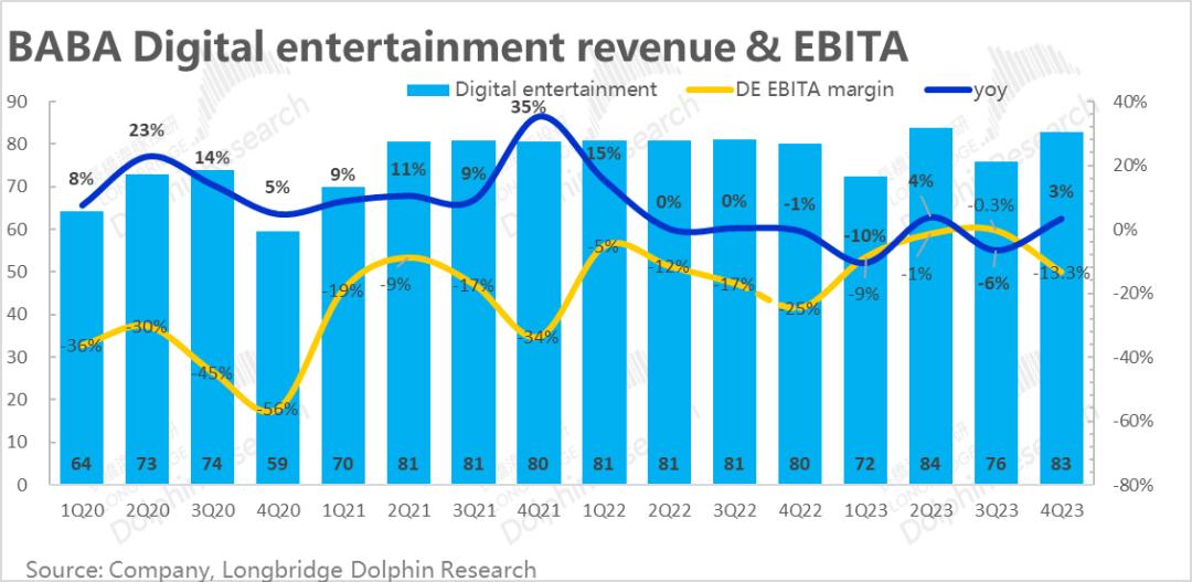 随着国内居民开始回归影院,本季度阿里文娱板块的营收同比增长了3%到83亿。同时在季节性利润低点的文娱板块虽然EBITA亏损率仍有13%,但实际同比来看已改善了超10pct。同样随着国内居民出门活动、玩乐继续修复,阿里文娱板块大概率也是能继续改善的。