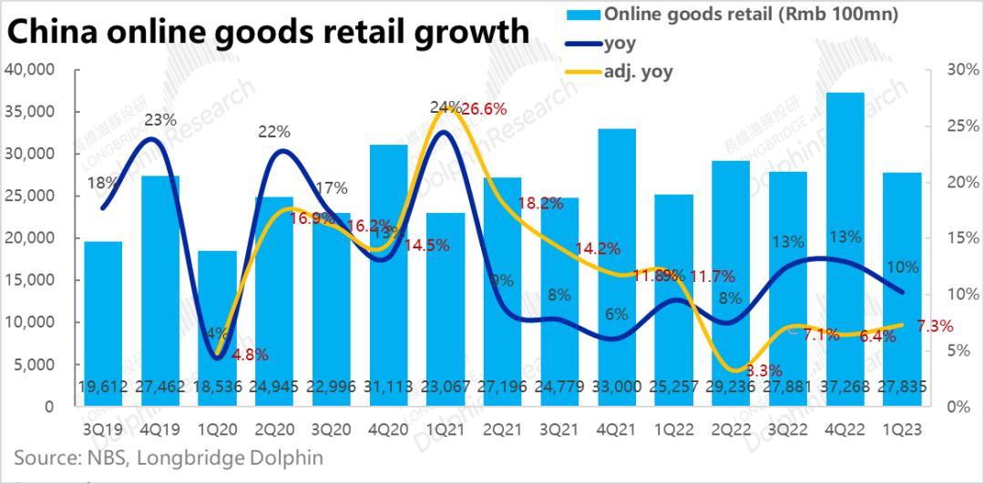 而公司披露,3月份内淘天平台的GMV增速已经转正,且向前来看随着国内居民出行、旅游的复苏,服侍等可选品的销售也已开始回暖,1-4月穿类商品,线上零售的增速就环比从8.6%,明显改善到了13.5%。