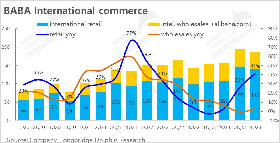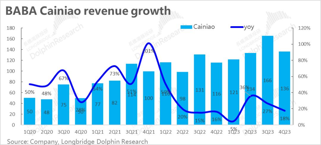 最为集团内第二顺位被拆分独立上市的板块,菜鸟物流本季实现营收136亿元,同比增速有所滑落到18%。虽然当前增长看似放缓,但这里主要是因为菜鸟会计模式调整(从4P物流转为1P和3P物流)的基数期已到,实际增速放缓应该不太明显,尤其是目前国际业务增速还不错。随着Lazard等海外电商重新发力增长,菜鸟大概率也会随之修复。