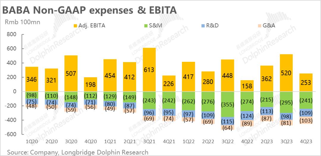 因此,虽然老大哥淘天平台增长尚未见起色,但在所有板块的共同努力下,市场最为关注的利润指标——调整后EBITA利润上达到了253亿,较去年同期的158亿几乎多了百亿。