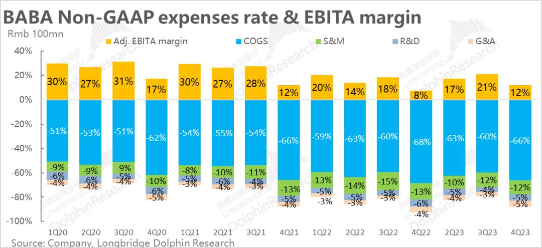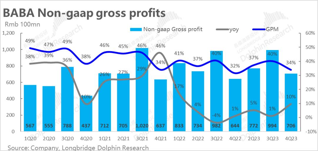 各亏损业务线目标一起看向自负盈亏,各板块努力降本提效的背景下,本季季度阿里整体实现了毛利706亿,毛利率从32%同比提升到了34%。虽然看似提升幅度不大,但在总营收几乎零增长的背景下,总毛利却增长了10%,增速连续改善。实现即便不增收,也能继续增利。