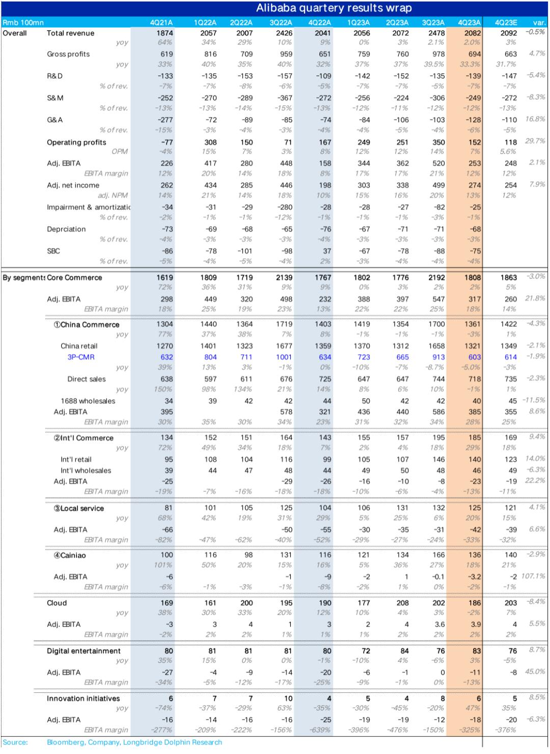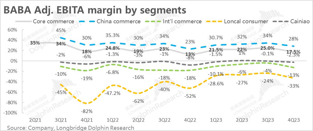利润层面,核心商务(包括上述板块)在剔除股权激励、摊销费用影响后的利润(调整后EBITA)接近317亿,远超去年同期232亿和市场预期的约260亿,利润率也同比从13%显著提升到了17.5%。虽然营收增长的确还比较难看,但降本增效和利润释放还在过程当中。
