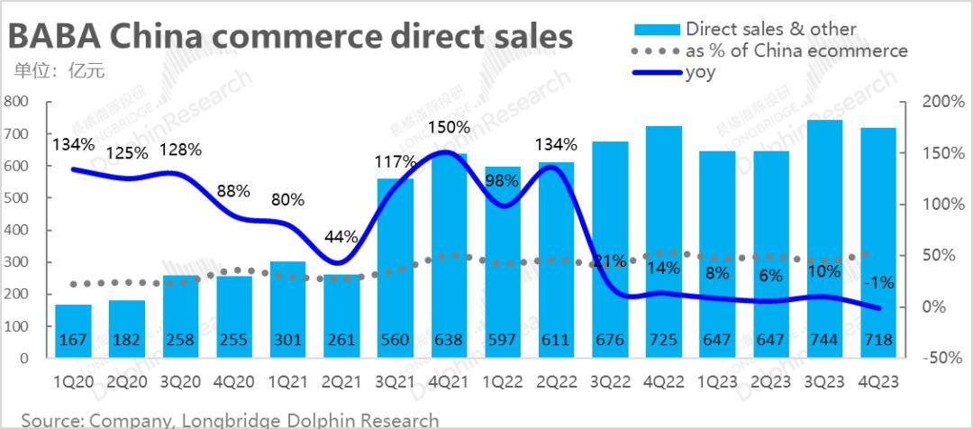 在Core-core的淘天业务外,阿里国内的重资产零售业务(包括盒马、高鑫零售、银泰、猫超自营及阿里健康等),本季度收入为 718亿元,同比也收缩了1%。虽然业务首次出现负增长,但考虑到去年较高的基数,且放开后居民对生鲜类即时零售的需求不再那么迫切,本季表现虽差但市场大体也有预期。