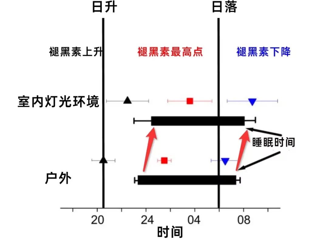 来自研究露营 vs 待在室内的睡眠时间对比,可以看到褪黑素更早分泌,睡眠时间前提,起床时间也前提了。图片来源:文献