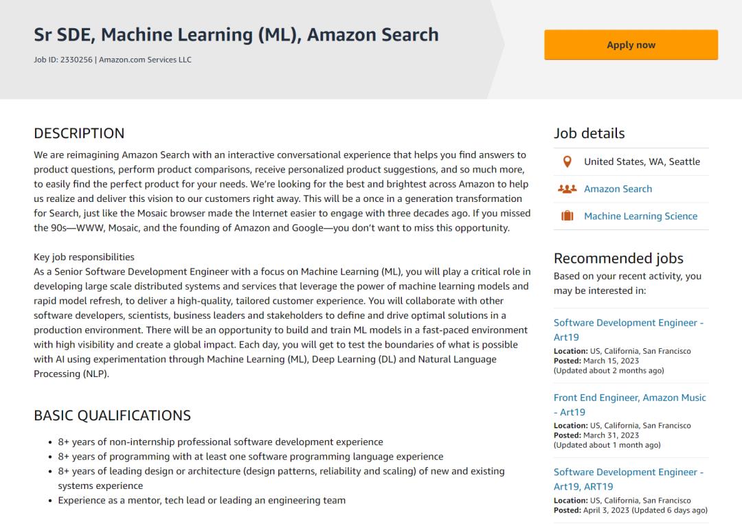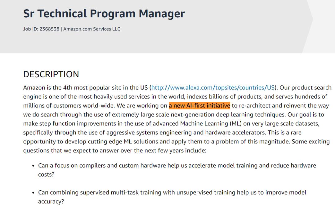 在另一份高级技术项目经理的招聘简介中,亚马逊也提到,公司正在开展一项新的“AI优先”项目,通过使用超大规模的下一代深度学习技术来重新构建搜索的方式。
