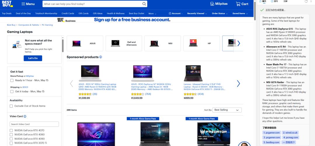 举个例子,如果要Bing推荐适合打游戏的笔记本电脑,在机器人给出的一系列参考链接中,不仅包括评测网站(其中也附带电商的跳转链接),还直接有百思买的网页跳转。微软此前也曾公开表示,正在探索如何在Bing聊天机器人中插入广告,并表示初步结果显示导流的效果非常好。