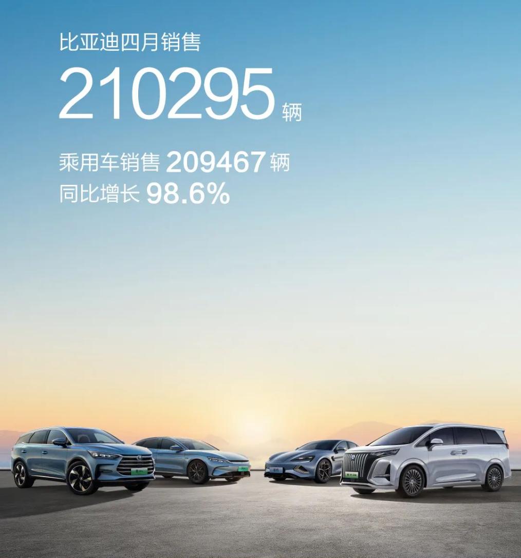 作为论据,明晃晃的数字不会说谎。根据比亚迪官方信息,4月新能源汽车销量达到210,295辆,同比增长约98.3%。新能源乘用车销量再度突破20万大关,达到209,467辆,同比增98.59%。