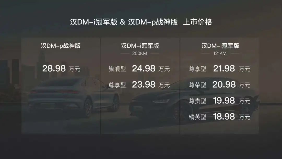 另外,根据消费者的反馈,汉DM-i冠军版增加了纯电续航达到200km的车型,混动模式下的续航则长达1260km。根据配置不同,售价分别仅为23.98万元、24.98万元。