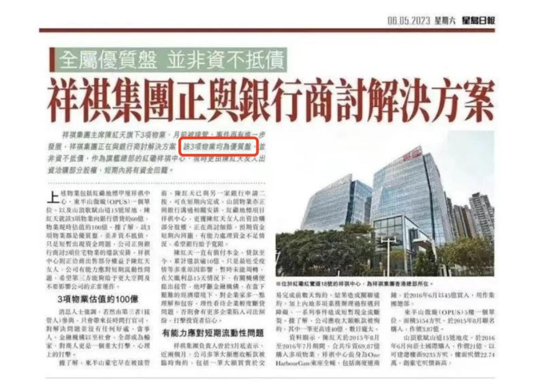 今年3月31日,祥祺集团通过同心俱乐部官微发布《关于近日媒体报道“陈红天香港物业被接管”的回应》,祥祺集团正在与银行商讨解决方案,该3项物业均为优质盘,并非资不抵债,作为旗舰总部的红磡祥祺中心,现时更由陈红天友人出资洽购部分股权,短期内将有资金回笼。