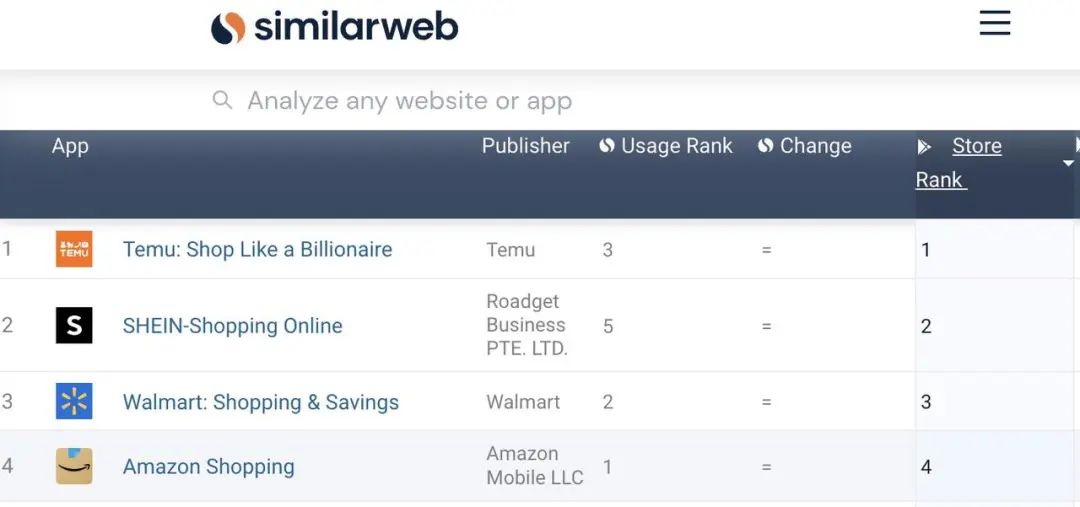 Shein和Temu的价格路线一致,两方的抗衡中,Shein平台模式需要注意的是:如何坚持低价路线而又不陷入压价的恶性竞争,如何既能保持低价优势又能保护好自身的盈利空间以及第三方卖家的利益。截至发稿时,美国应用商店程序排名前五中,Temu以第一领先,Shein排在第二位,Temu的实力不容小觑。