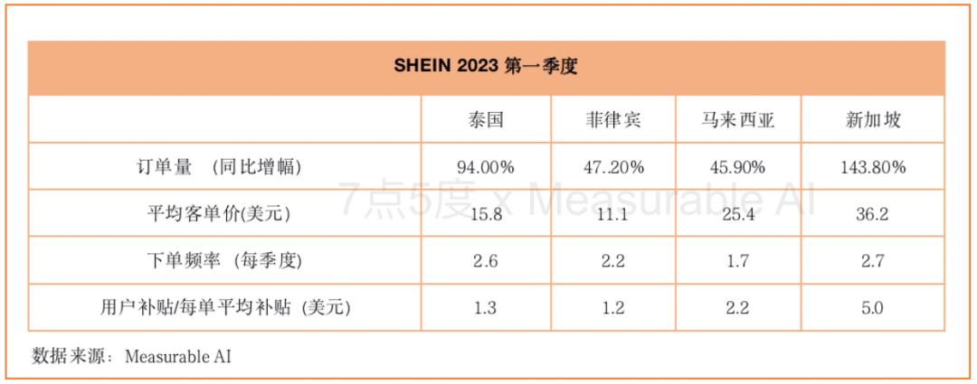 从专注于新兴市场的另类数据公司Measurable AI 提供的最新数据来看,Shein在东南亚的增长势力不减。在今年第一季度,Shein在泰国、菲律宾、马来西亚和新加坡的订单量同比增长超过40%,其中泰国和新加坡市场的增长最为突出,分别达到94.0%和143.8%。值得注意的是,Shein在新加坡市场不仅订单量增长最高,其平均客单价也稍高,达到36.2美元,用户每单平均补贴达到5美元,均远超其他东南亚国家。但整体而言,Shein在东南亚的平均客单价要低于其75美金的全球平均客单价。