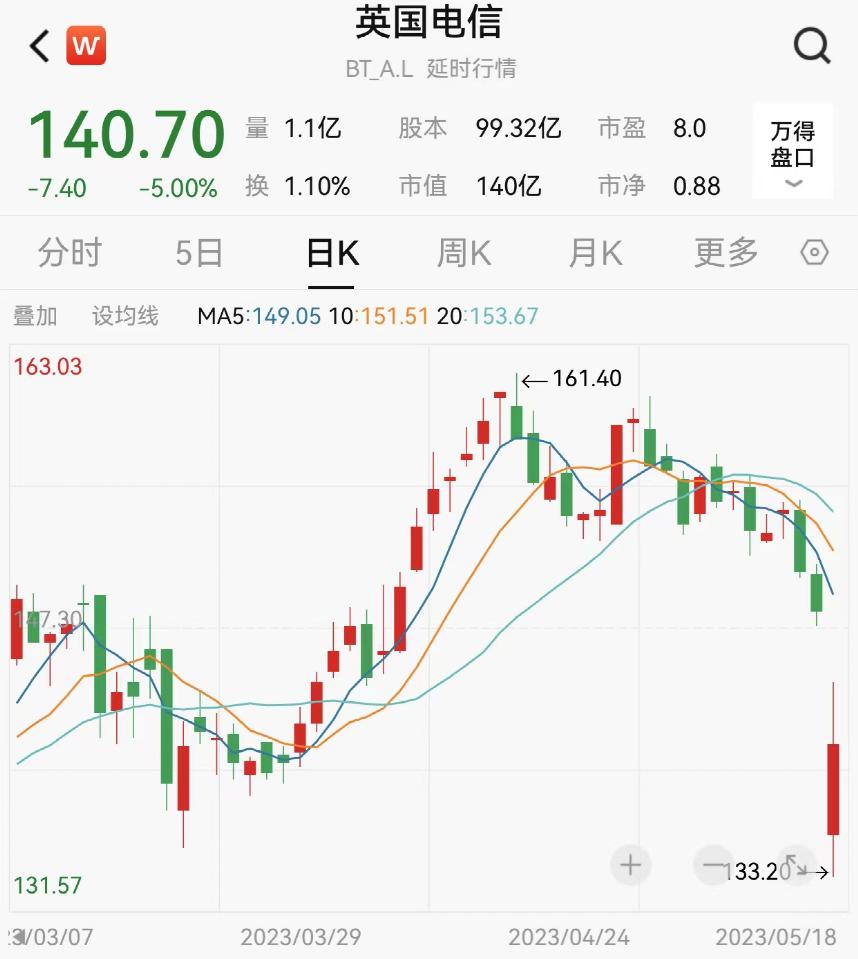 5月18日,英国电信股价跌5%,报140.70便士/股。