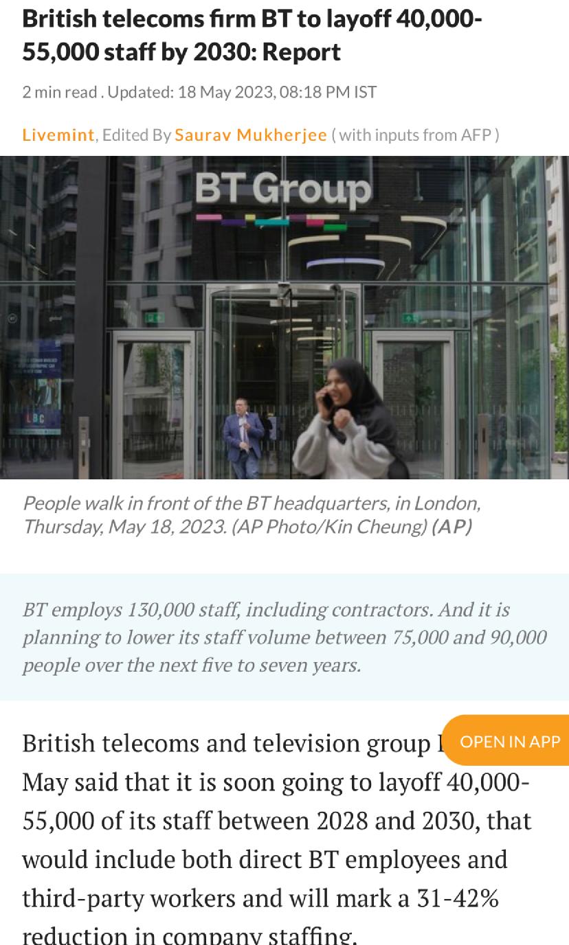 英国最大电信运营商,2030年前拟裁员最多5.5万人