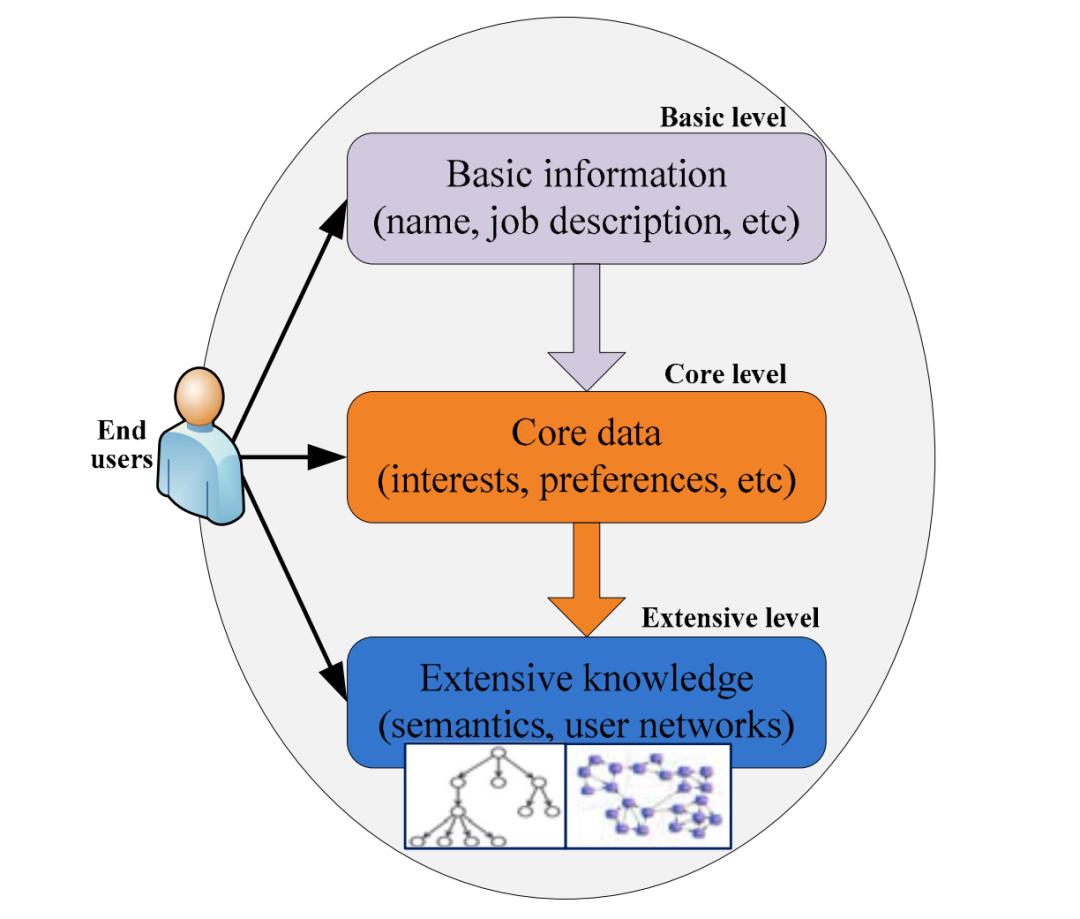 基础层涵盖了用户的身份信息,如用户姓名和职业等基本信息;中间核心层描述了重要的用户特征,如用户兴趣、偏好、目标等;底层扩展层包含带有用户特征的个性化知识,包括通过语义关系分析和推理得到的用户兴趣、偏好和个性化的模型网络。