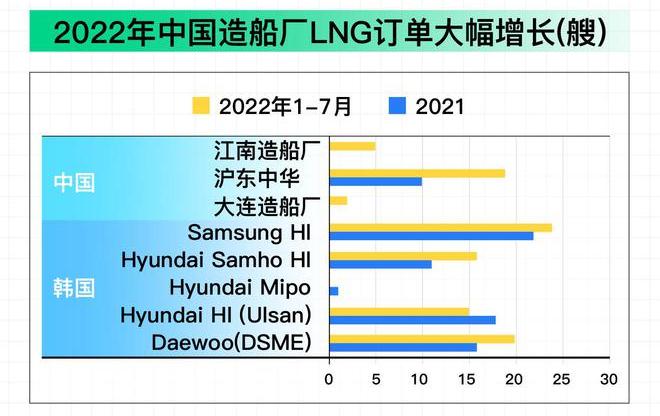 特别是在17.4万立方米的LNG船方面,韩国船企的订单量占了89.3%,几乎是无法超越的垄断地位。