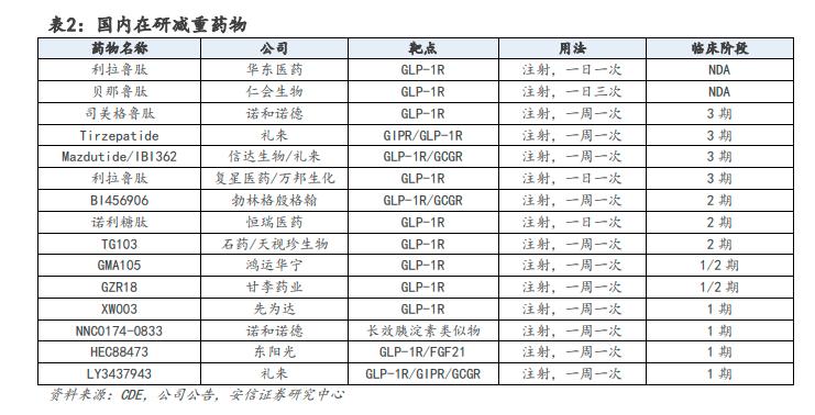 据安信证券,目前国内已有多家企业布局GLP-1的减重适应症。其中进展最快的主要有已在NDA阶段的华东医药利拉鲁肽仿制药、仁会生物的贝那鲁肽。