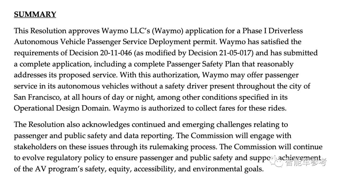 Waymo在旧金山落地进度比Cruise晚了一步,这份文件代表着Waymo将可以在旧金山开启全无人、全天候的收费运营了。