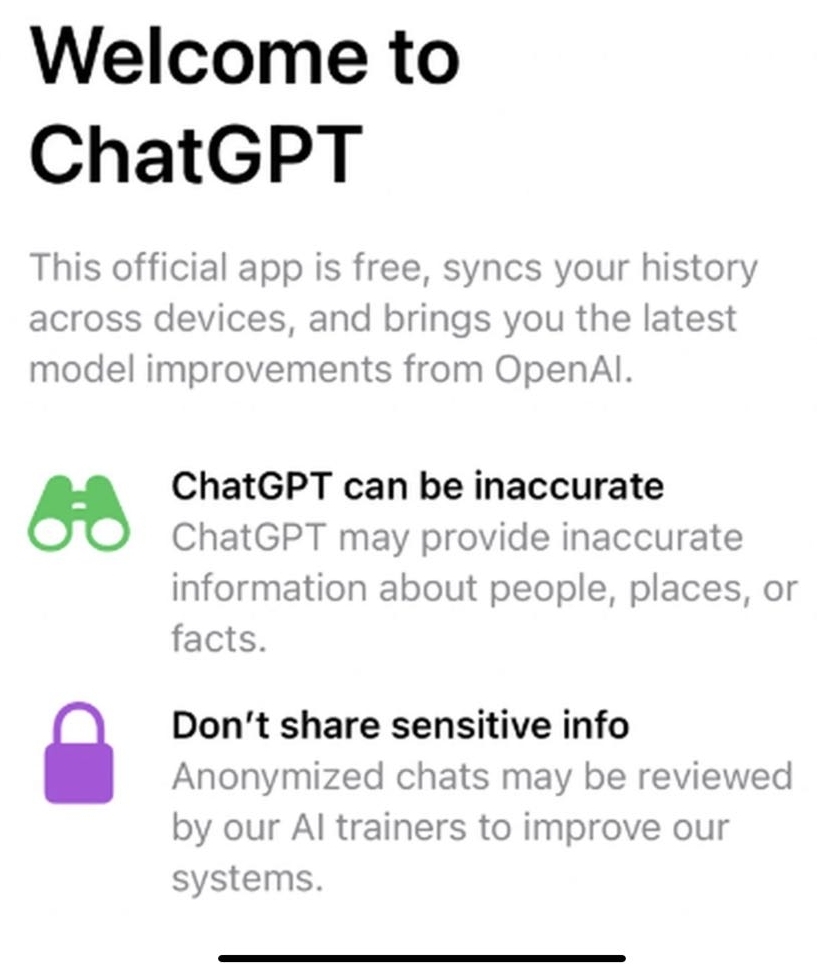 值得注意的是,移动版ChatGPT在其开机界面特别强调了其可能提供并不准确的信息,并且提示不要分享敏感信息,这些信息有可能被AI训练师查看。