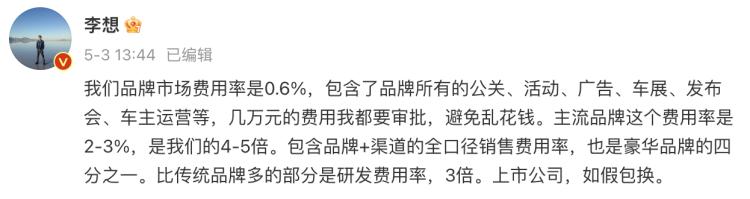 说到这里,在营销上,著名“扣厂”理想一直以来都被看作是特斯拉的“国内版”。前段时间,关于车企营销的话题引发热议,理想汽车创始人李想也在微博上发表了自己的看法。事实上,确实就是没有人会在营销上不花钱——理想也是,只是比较少,据李想在微博中提供的数字,理想的品牌市场费用率虽然只有0.6%,不过一年也有6亿元-7亿元左右,但低至几万元的费用都需要李想本人亲自审批。