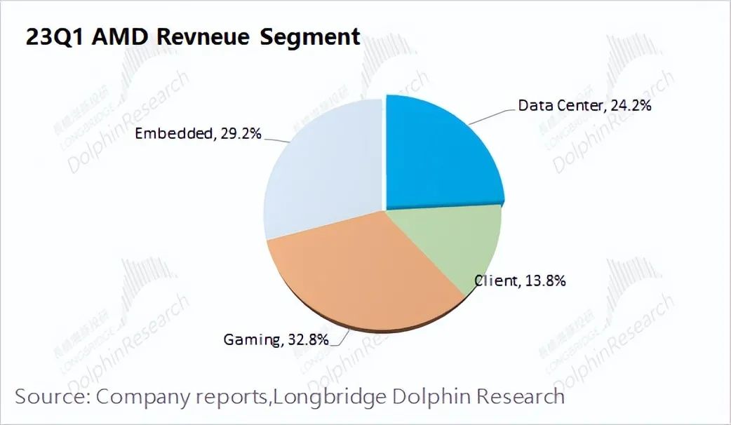 ②Client:这主要是涉及PC及notebook产品,包括Ryzen系列的CPU解决方案也都归纳于该业务内;该业务原本是AMD最核心的业务之一,但随着PC市场的疲软,本季度占比下滑至不到15%;