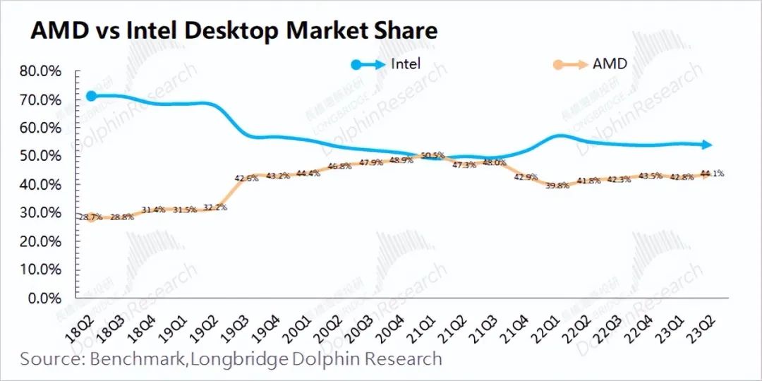 对于当前的AMD业务,①CPU业务:奋起急追,不断侵蚀英特尔的份额,尤其在桌面级市场开始撵上;②GPU业务:和英伟达相比,在技术和份额上仍有差距。虽然英特尔也开始进入独显,但整体技术上和公司有较大差距。