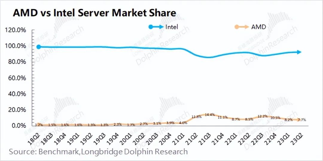 2)服务器市场:随着市场对AIGC和云等方面重视度的提升,服务器也是竞争的一大重心。然而,此前服务器市场基本是被英特尔垄断的情况。随着AMD EPYC处理器产品的推出,逐渐获得了市场认可。当前AMD在服务器领域已经从过去可以忽略的存在(2%以下的市占率),已经成长至将近两位数。随着AMD对服务器和数据中心业务的重视,未来有望获得更多的市场份额。