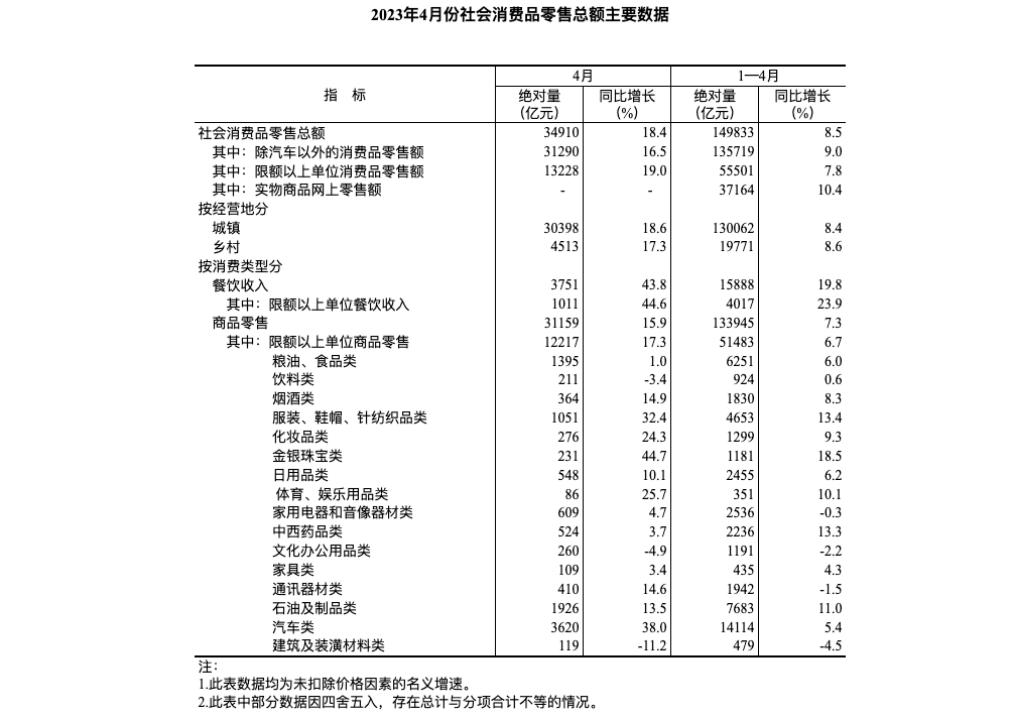 根据国家统计局发布的数据,今年1-4月份,社会消费品零售总额149833亿元,同比增长8.5%。其中,除汽车以外的消费品零售额135719亿元,增长9.0%。从消费类型来看,1—4月份,商品零售133945亿元,同比增长7.3%;餐饮收入15888亿元,增长19.8%。
