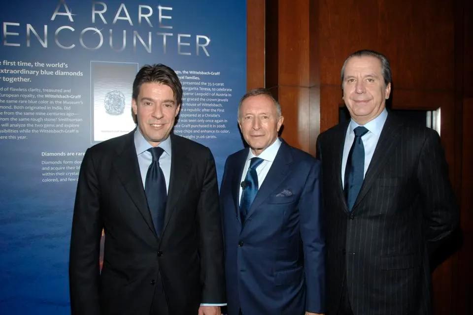 图片拍摄于美国华盛顿特区,2010年1月28日。从左至右分别是:弗朗索瓦·格拉夫(Francois Graff)、劳伦斯·格拉夫(Laurence Graff)和亨利·巴格吉安(Henri Barguirdjian)。他们当天出席史密森尼国家自然历史博物馆举行的WITTELSBACH-GRAFF钻石揭幕仪式。 图片来源:DAVID X PRUTTING/Patrick McMullan/Getty Images